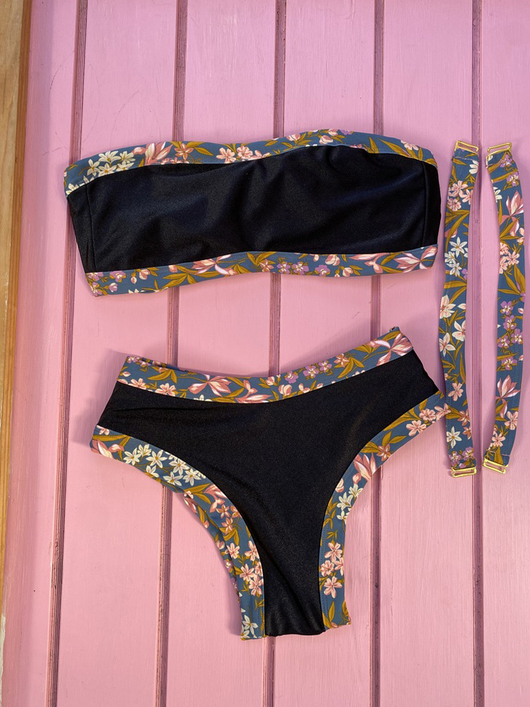 Bikini con bretel desmontable para usar como straples anudado en la espalda y elásticos internos para mayor firmeza, mas calzón modificable.