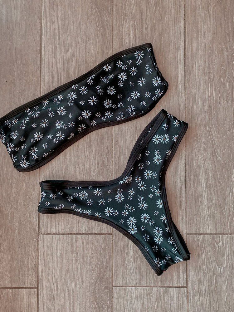 Bikini strapless anudado en la espalda con calzón vedetina, semi colaless pero modificable ( calzón ) .