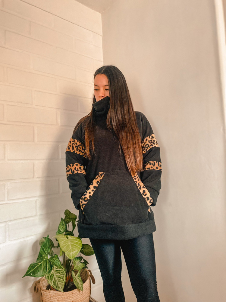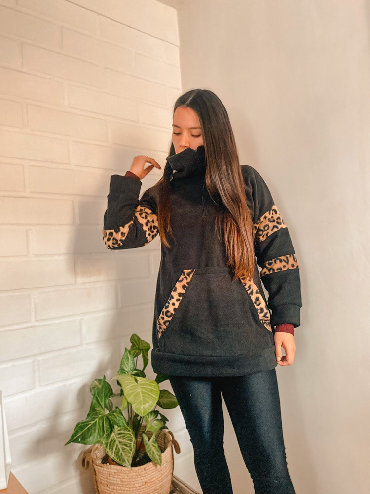 Polar Print con cuello alto y bolsillo canguro, muy calientito y holgado. Con medio cierre.