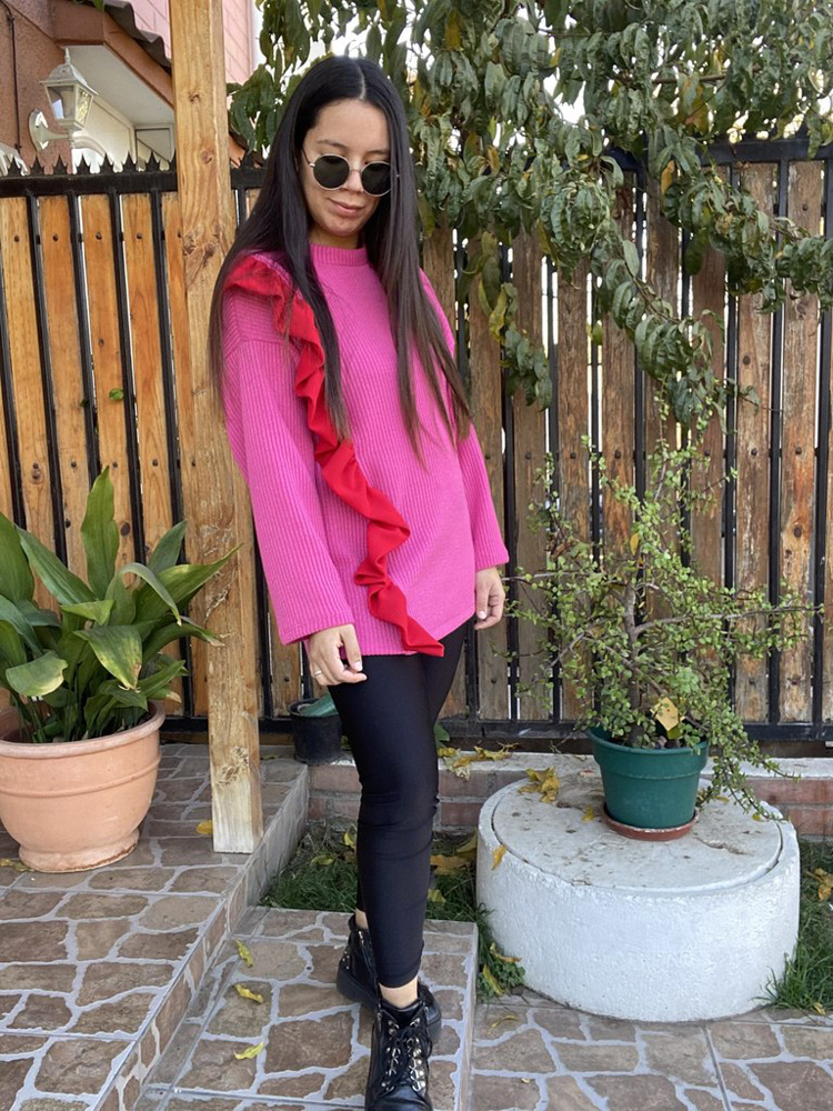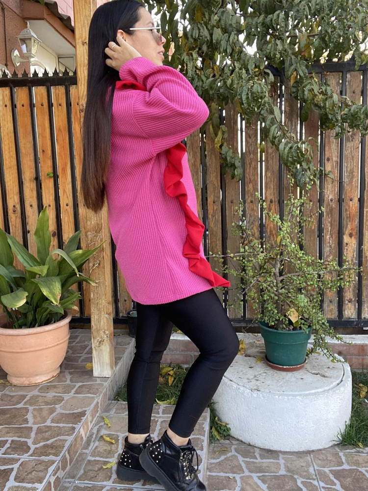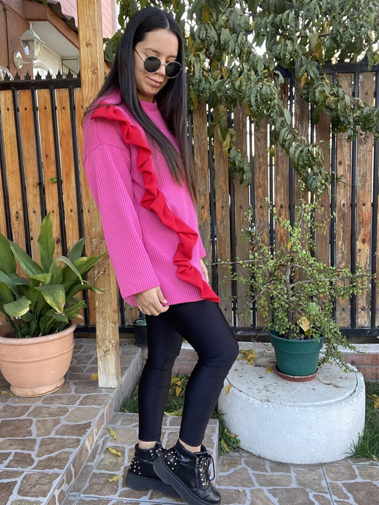 Sweater de lanilla con largo de 74 cms desde el hombro, aplicacion de vuelo en tela sofia. Ideal para esta temporada de calido y frio. Alu