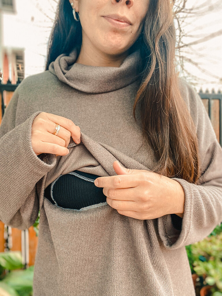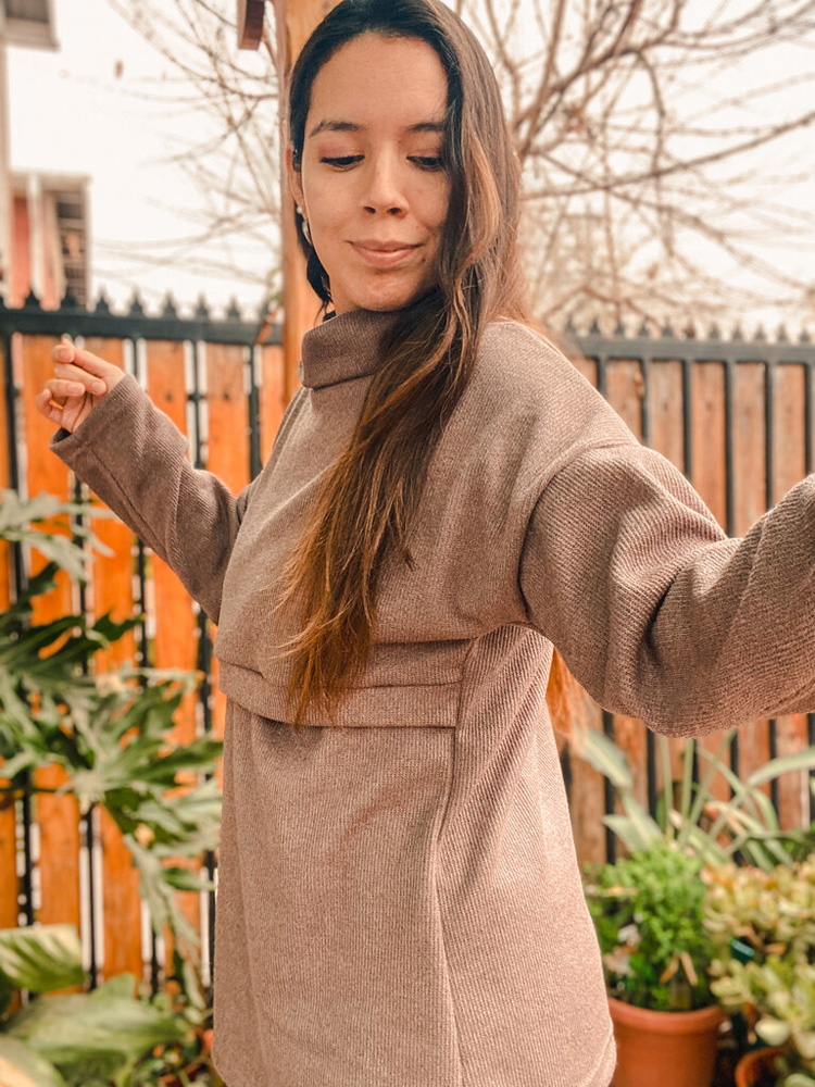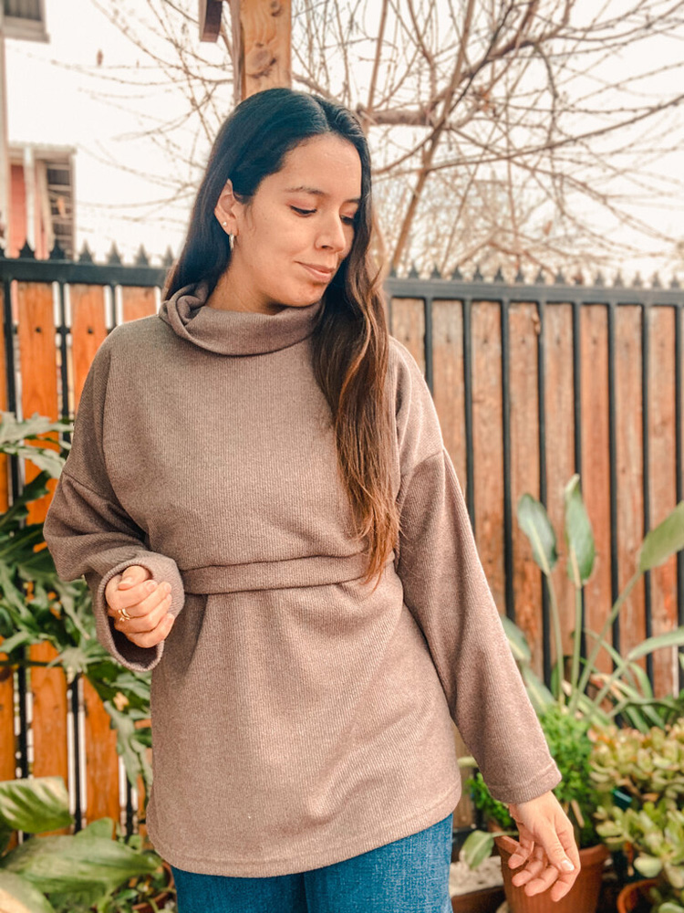 Sweater de lanilla con abertura bajo busto ideal para la etapa de lactancia, holgado y de largo modificable.