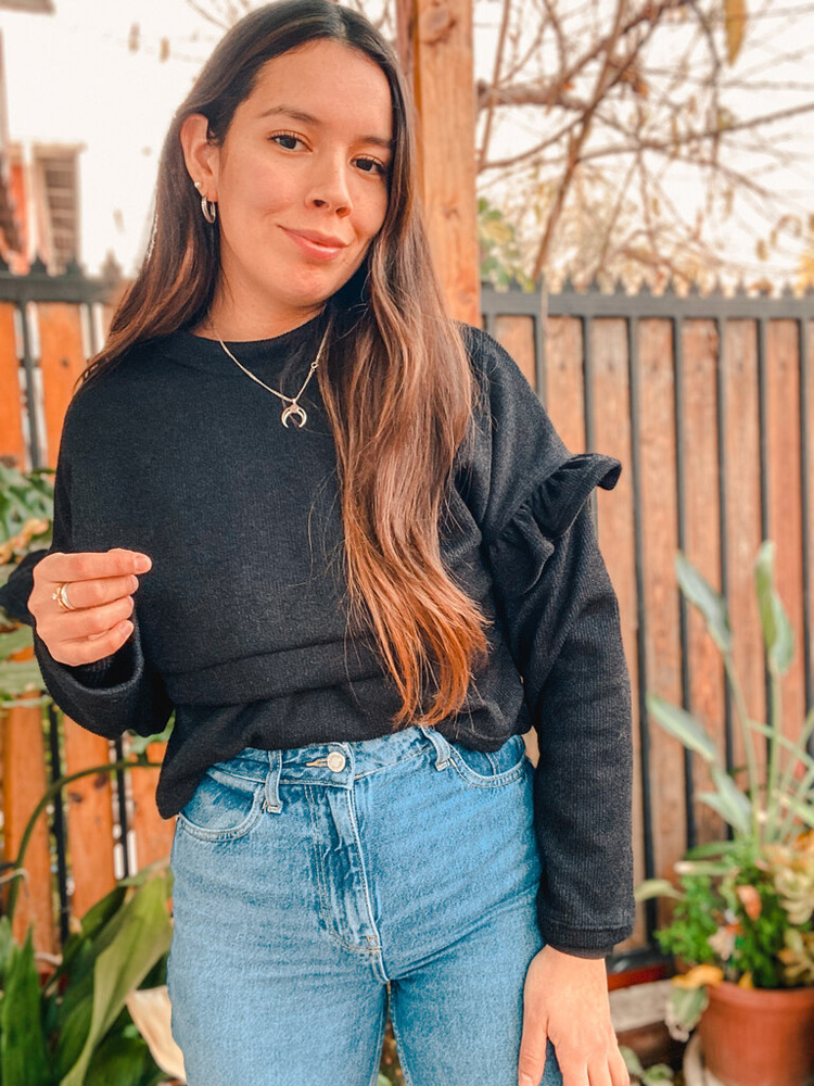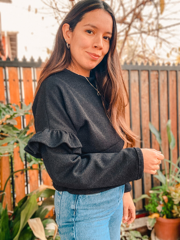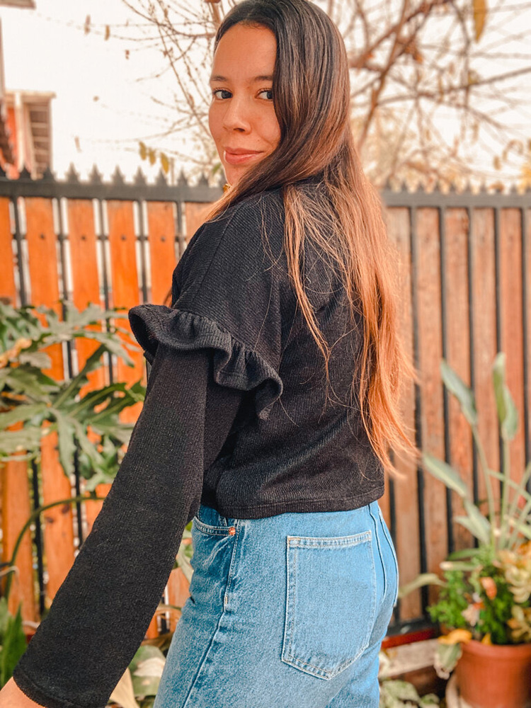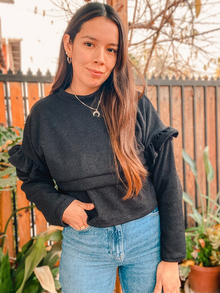 Sweater de lanilla para amamantar con abertura en el busto para mayor comodidad. Largo modificable.