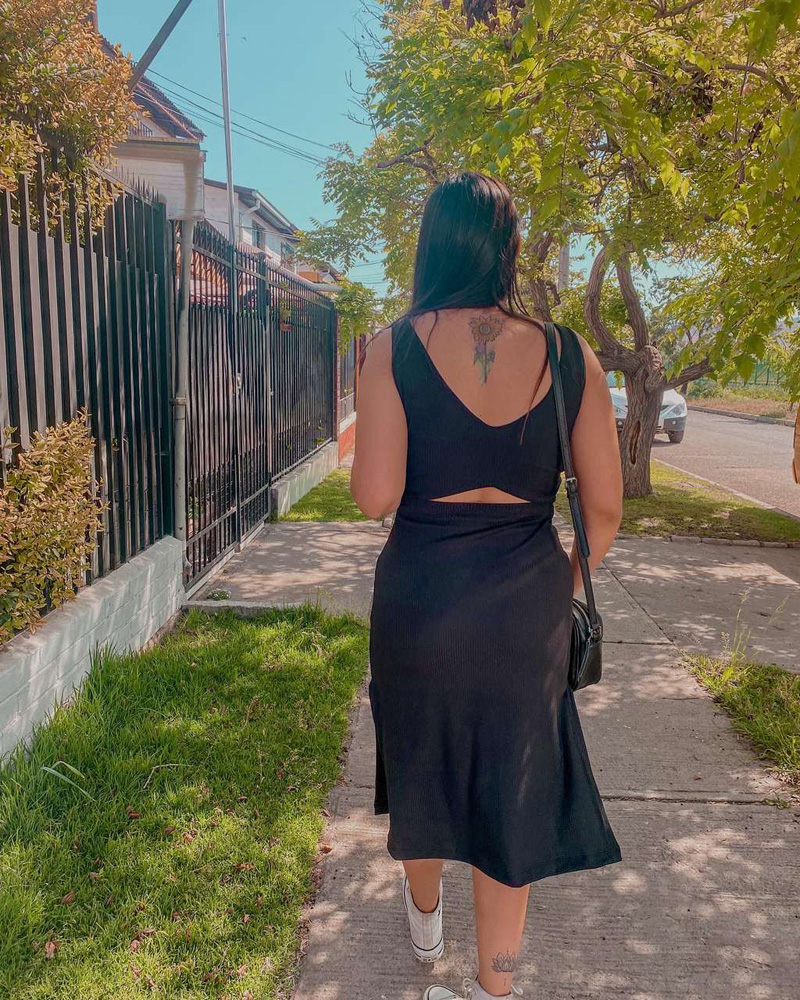 Nuestro vestido básico negro esta hecho con una tela canuton muy elasticada , en la parte superior es doble tela lo que permite poder usarlo sin sostén. Largo bajo la rodilla con aberturas en los costados muy cómodo y liviano ideal para los días de playa . Alu