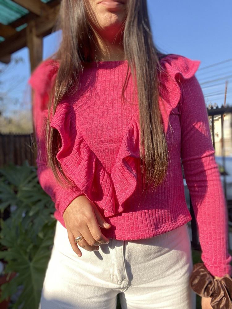 Polera de mujer con tela de lanilla elástica además de vuelo en la parte delantera. Largo modificable según tu necesidad.
