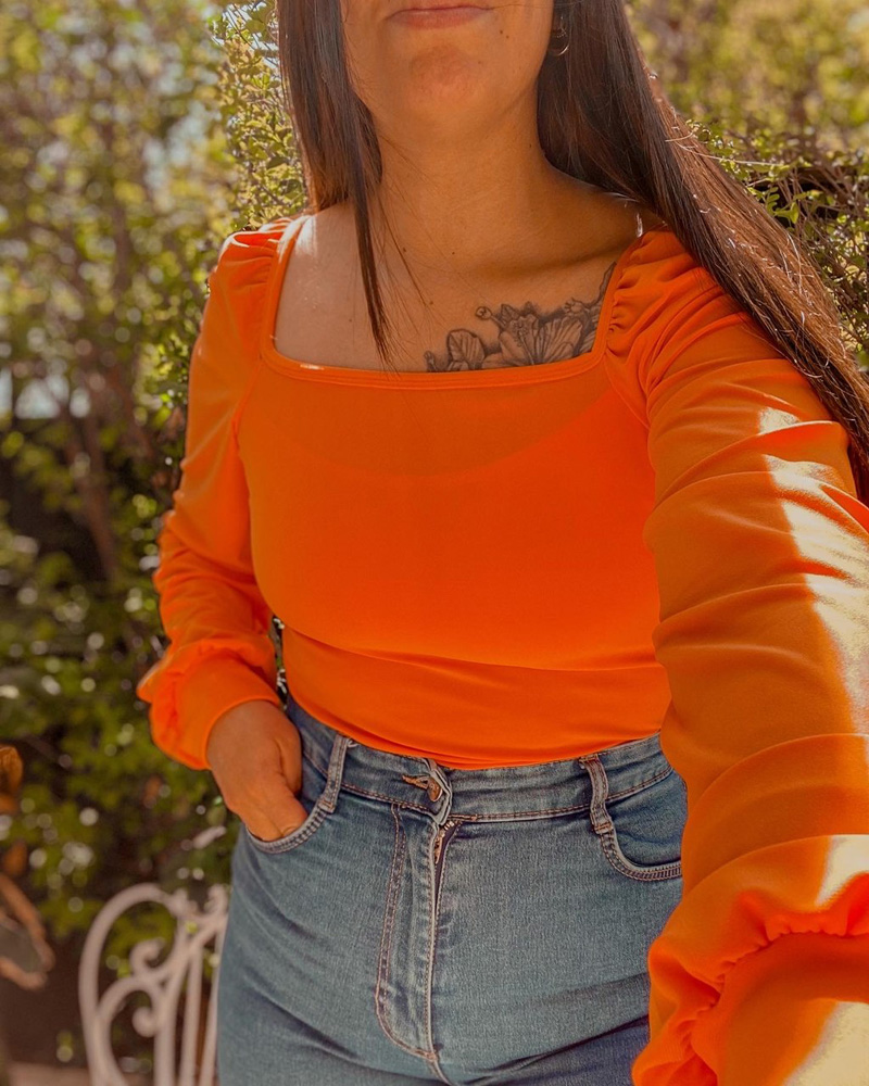 Polera de tela  esticada y delgada ideal para esta temporada, mangas princesa con el toque Alu. Largo hasta la cadera.