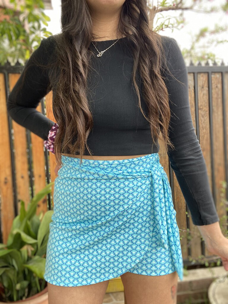 Falda Short elasticada de tela suplex sin cierre y lazos en la parte delantera. Muy cómoda y versátil.