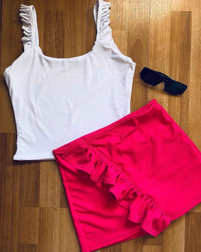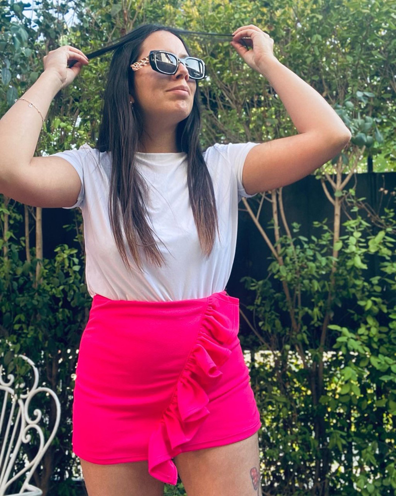 Falda de tela elasticada ( Sofia ) muy cómoda desde la talla 36 a 46 de pantalón, con un vuelito frontal que le da el toque Alu.