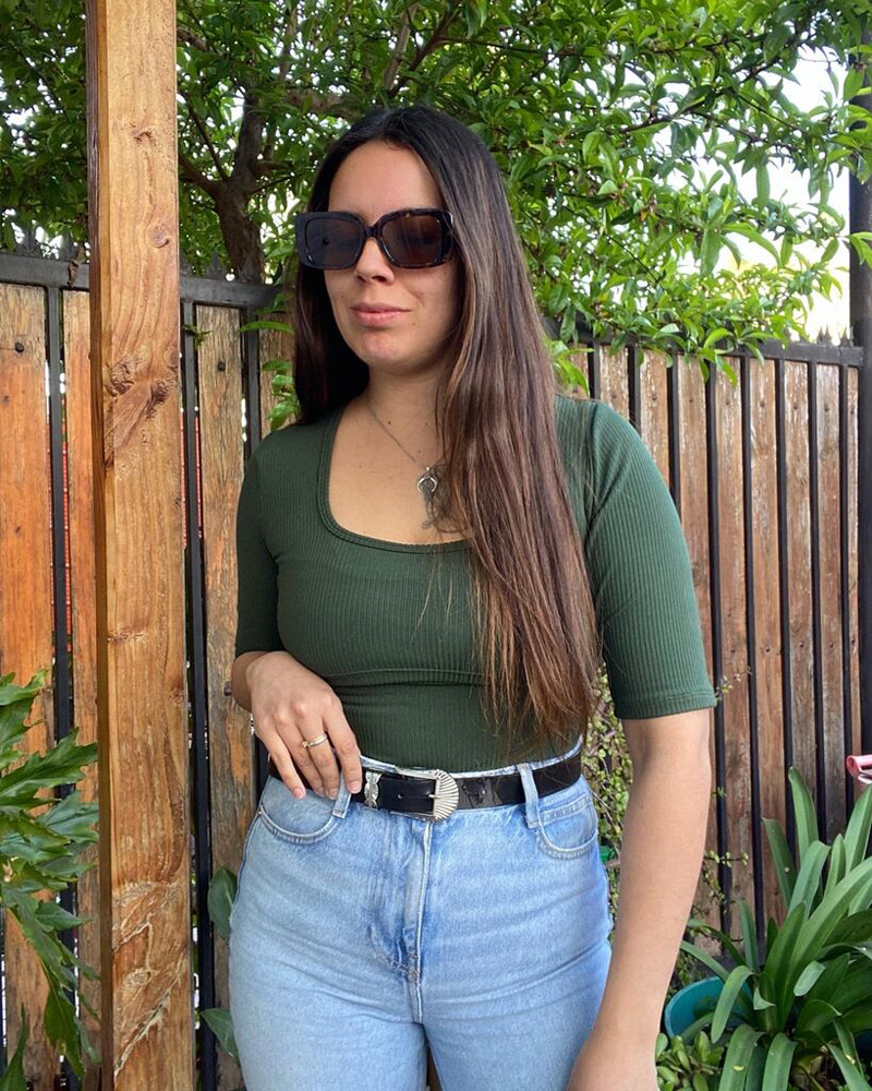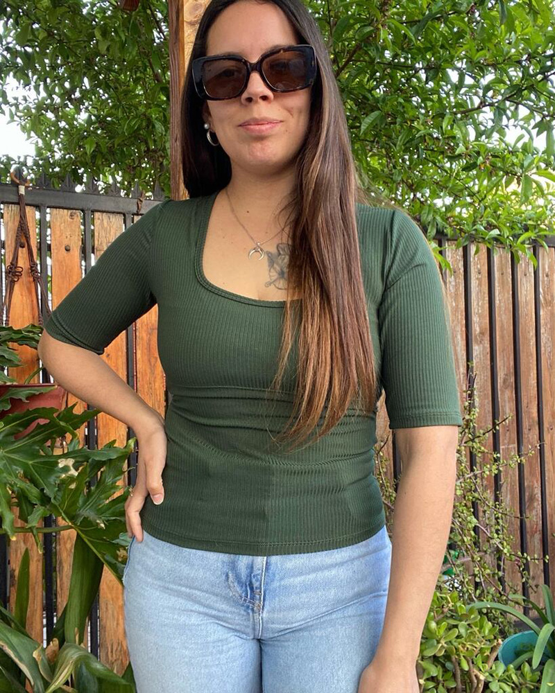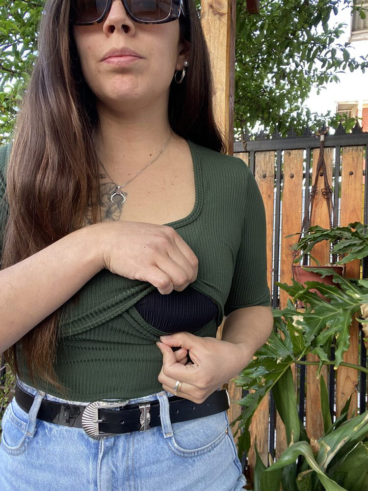 Polera de de tela canuton adaptada para lactancia de manga corta.