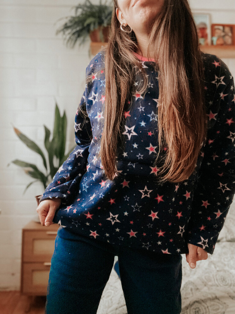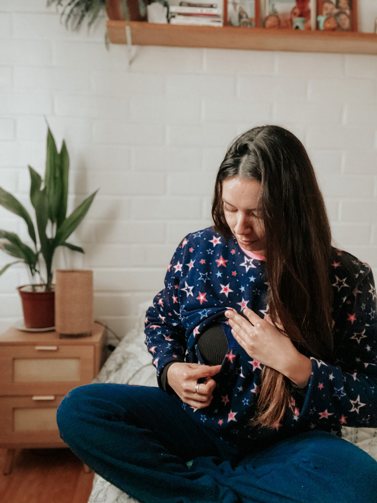 Pijama de polar con abertura de lactancia. Conjunto completo de pantalón y polerón.