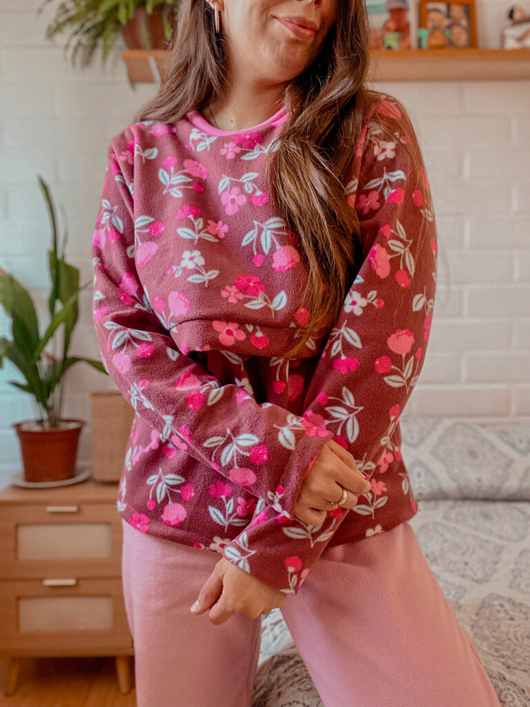 Pijama de polar con abertura de lactancia. Conjunto completo de pantalón y polerón.